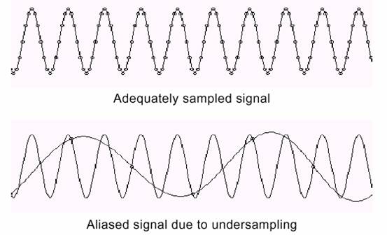 采樣率過低的結(jié)果是還原的信號的頻率看上去與原始信號不同。這種信號畸變叫做混疊(alias)。出現(xiàn)的混頻偏差(alias frequency)是輸入信號的頻率和最靠近的采樣率整數(shù)倍的差的絕對值。