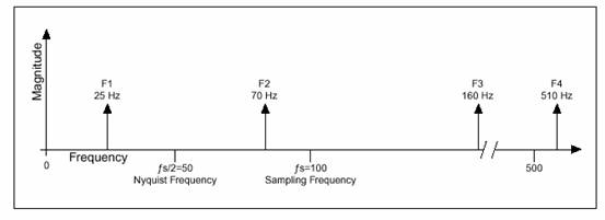 圖3給出了一個例子。假設(shè)采樣頻率fs是100HZ,,信號中含有25、70、160、和510 Hz的成分。