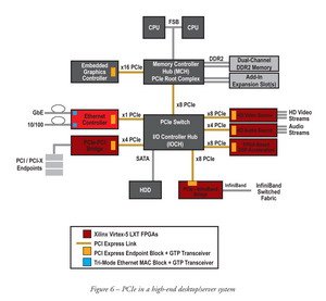 l更快的上市時(shí)間。現(xiàn)有的 ASSP 大多不能支持今天的 PCIe;FPGA 可把并行的專(zhuān)有協(xié)議接口和 PCIe 之間搭建一座橋梁。此外,PCI Express 標(biāo)準(zhǔn)的持續(xù)改變,在形成廣泛市場(chǎng)基礎(chǔ)前,阻止了 ASIC/ASSP 的發(fā)展。一個(gè)典型的案例是最近于2006年9月召開(kāi)的英特爾開(kāi)發(fā)者論壇上由英特爾和IBM共同發(fā)布的 “Geneseo” 架構(gòu)以推動(dòng)新應(yīng)用的發(fā)展。Xilinx 公司也積極支持?jǐn)U展 PCIe 構(gòu)架的倡議。