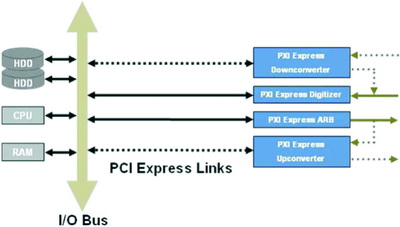 要實(shí)現(xiàn)高效率的數(shù)據(jù)流盤,并不是采用高速的總線加高速讀取的磁盤就可以實(shí)現(xiàn)的,還需要采用合理的流盤架構(gòu)。下面介紹不同的流盤架構(gòu)及特點(diǎn)。 使用普通PCIe架構(gòu) PCIe總線是一種串行總線,單線傳輸(x1)可以達(dá)到250MB/s,16線(x16)時(shí)傳輸速率可達(dá)4GB/s,各設(shè)備專用各自總線,因此傳輸速率較高,如圖2所示,數(shù)據(jù)先存儲(chǔ)到設(shè)備緩存上,再直接傳遞到I/O總線,經(jīng)過RAM、CPU、傳遞到硬盤上,此時(shí)的瓶頸主要存在于讀寫硬盤的速度。一般存儲(chǔ)/讀取的速度均在100MB/s以上。  圖2 PCIe數(shù)據(jù)存儲(chǔ)/讀取 使用直接讀/寫盤結(jié)構(gòu) 以上結(jié)構(gòu),數(shù)據(jù)都要經(jīng)過I/O總線、內(nèi)存和CPU,在一定程度上該過程限制了存儲(chǔ)/讀取的速度,而且CPU的多線程性又增加了丟失數(shù)據(jù)的可能性和系統(tǒng)的不穩(wěn)定性,所以出現(xiàn)了直接讀/寫盤結(jié)構(gòu)。該結(jié)構(gòu)原理如圖3所示,數(shù)據(jù)從設(shè)備的緩存中讀出后直接寫入磁盤,或者從磁盤中讀取后直接輸出。  圖3 直接讀/寫盤結(jié)構(gòu) 該結(jié)構(gòu)有兩種典型應(yīng)用,一種是NI的PXI系統(tǒng)配合Express Card接口卡、RAID磁盤陣列,數(shù)據(jù)從設(shè)備緩存讀取后經(jīng)PCI總線不經(jīng)過系統(tǒng)內(nèi)存和CPU直接經(jīng)過Express Card接口卡存入RAID磁盤陣列,持續(xù)存儲(chǔ)速度可達(dá)100MB/s(見圖4所示)。  圖4 PXI總線直接讀/寫硬盤 另一種典型結(jié)構(gòu)是NI的PXIe總線結(jié)構(gòu),該結(jié)構(gòu)通過PXIe總線上的一款專門的數(shù)據(jù)流盤卡,對(duì)RAID磁盤陣列進(jìn)行數(shù)據(jù)的寫入/讀取。持續(xù)寫入/讀取速度可以達(dá)到300MB/s、600MB/s甚至更高(見圖5所示)。  圖5 PXIe流盤系統(tǒng)(NI的600MB/s流盤設(shè)備) 結(jié)語