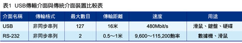 表1為USB傳輸介面與傳統(tǒng)介面裝置的相關(guān)規(guī)格比較。