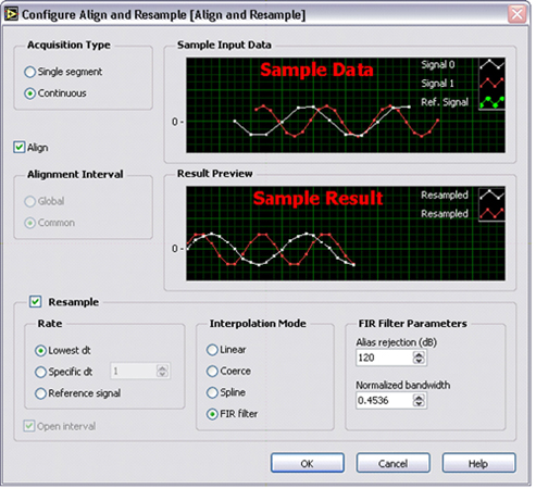 LabVIEW中的「Align and Resample」Express VI即提供簡單易用的接口(圖7),可設定對齊或重新采樣作業(yè)。一旦設定完畢,只要將多組波形傳輸至「align and resample.vi」,即可執(zhí)行處理作業(yè),此表達式亦可實時或于后續(xù)處理時套用。