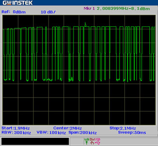 測量信號頻率時(shí),可以打開峰值保持,將中心頻率設(shè)在2MHz。頻率跨度的選擇須考慮與解析頻寬(RBW)的搭配,若測量范圍(SPAN)和RBW相差很大,加上信號擷取困難,測得頻率所需時(shí)間會非常長;若SPAN和RBW相差很小,則容易造成頻率測量不準(zhǔn)確。可選擇30kHz的RBW和1MHz的SPAN,在這種情況下,頻譜分析儀不能保證對每一個(gè)瞬時(shí)信號都能成功擷取,所以在頻譜分析儀上看到的頻譜變化間隔往往大于2秒,這是由于SPAN大于RBW時(shí),若信號進(jìn)入頻譜分析儀時(shí)其實(shí)時(shí)掃描的頻率偏離信號真實(shí)頻率,則信號將無法被擷取,但經(jīng)過稍長的一段時(shí)間(取決于SPAN和RBW之差)后,依然能在峰值保持的模式下觀察到信號累積的頻譜情況,根據(jù)此一圖像可輕易透過搜索峰值讀出信號頻譜中心點(diǎn)的頻率,精準(zhǔn)度可以達(dá)到kHz的級別,如圖3所示,測得信號頻率為2.0MHz。