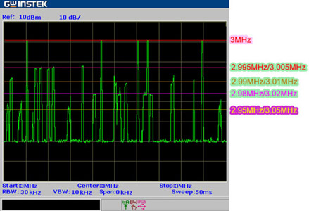 一般產(chǎn)線對信號的頻率和功率同時(shí)都有較嚴(yán)格的要求,分別進(jìn)行功率、頻率通過測試的方法在實(shí)際運(yùn)用中還是稍顯繁瑣,這里推薦另外一種綜合測試的方法,其特點(diǎn)是首先將SPAN設(shè)置為零頻跨,將擷取的信號的持續(xù)時(shí)間設(shè)為500微秒、頻率設(shè)為3MHz的信號、功率1dBm與發(fā)送間隔為1秒,然后利用信號產(chǎn)生器將信號的頻率在3MHz附近調(diào)整。由于中心頻率3MHz,零頻跨的頻譜分析儀掃描的范圍只在3MHz這一點(diǎn)上,根據(jù)濾波器的特性,有微小頻率偏移的信號擷取后的功率會被衰減,分別將信號的頻率以3MHz為中心左右調(diào)偏50kHz、100kHz、200kHz和500kHz,信號衰減后的功率幅度如圖7所示。