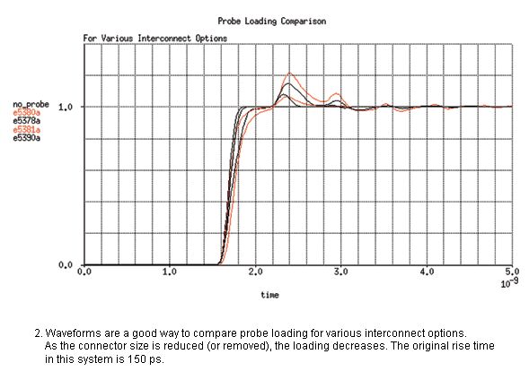 針對(duì)更輕電氣負(fù)載應(yīng)用的最新探頭是“無連接器”探頭。在無連接器探頭中,測試焊盤被置于目標(biāo)系統(tǒng)上。邏輯分析器探頭具有連接目標(biāo)系統(tǒng)的壓縮互連特性。通過從電氣通道中去除物理連接器,其通道上的電容非常低(見表)。圖2顯示了多種探頭外形因子的等效集總電容,以及這些探頭對(duì)上升時(shí)間為150ps的系統(tǒng)的影響。