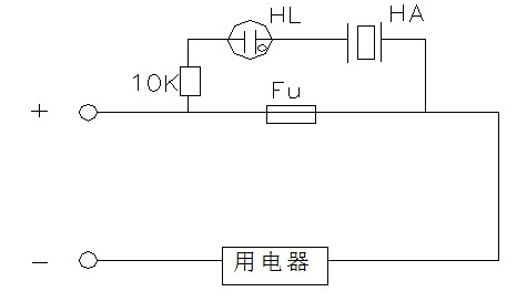 如下圖所示,當熔絲FU熔斷后,220V交流電通過用電器加至報警器上,氖泡兩金屬片間發(fā)生放電閃光于是在陶瓷壓電片HA上產(chǎn)生連續(xù)報警聲。