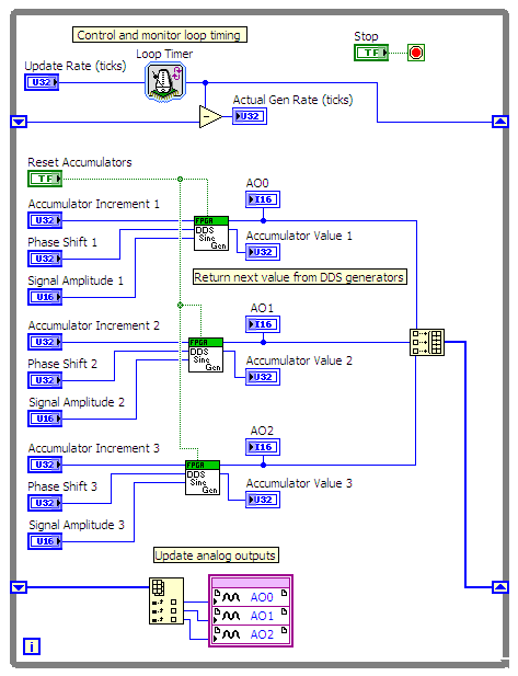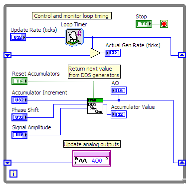 數(shù)字頻率發(fā)生器是放在一個(gè)循環(huán)中的子用于生成波形信號(hào)。每一個(gè)電話的頻率發(fā)生器遞增累加器和返回下一個(gè)值的信號(hào)波形。輸出的頻率發(fā)生器是通過一個(gè)模擬輸出節(jié)點(diǎn)或可進(jìn)一步加工的應(yīng)用。本文提供的例子的輸出的頻率發(fā)生器是通過一個(gè)移位寄存器更新前的模擬輸出。這流水線技術(shù)使操作的頻率發(fā)生器和模擬輸出發(fā)生在平行,使更高更新率的物理輸出。在一系列板這個(gè)例子將運(yùn)行的最大1兆赫的更新率的模擬輸出。