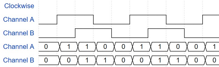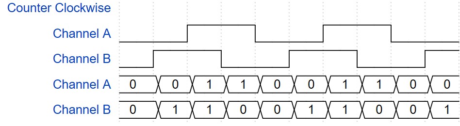 增量編碼器通常以兩個數(shù)字信號的形式輸出數(shù)據(jù),以指示位置和旋轉(zhuǎn)方向,該數(shù)字波形看起來像兩個相位相差 90 度的方波,如下圖所示。輸出這些信號的增量編碼器有時被稱為正交編碼器。在光學(xué)編碼器的情況下,這是通過使用 LED、圖案盤和高速光電傳感器來實現(xiàn)的。當(dāng)編碼器轉(zhuǎn)動時,帶圖案的圓盤要么允許來自 LED 的光穿過光電傳感器,要么被阻擋。這會產(chǎn)生所需的方波行為。圓盤有兩個相位相差 90 度的圖案,這會產(chǎn)生兩個異相方波。通過識別哪個方波領(lǐng)先另一個方波,