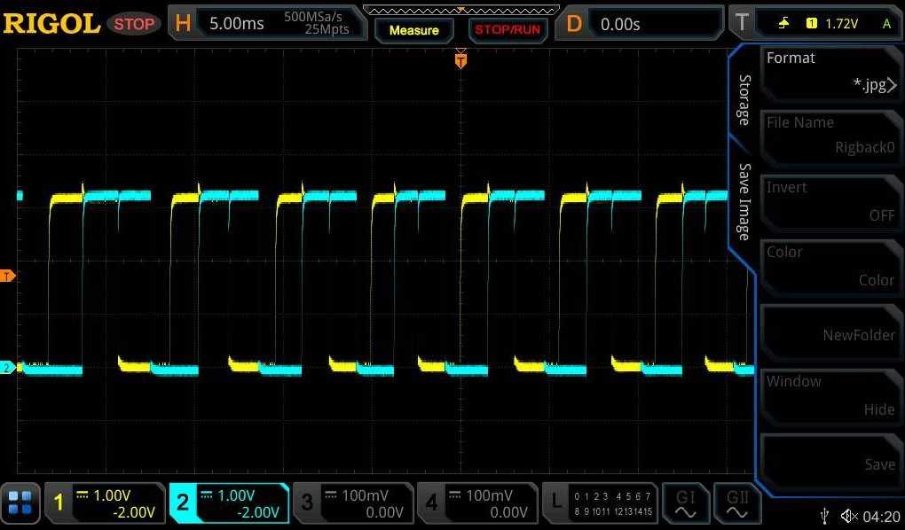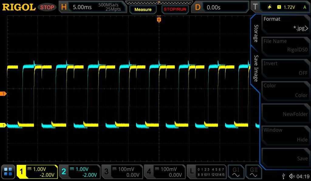 要在接線后測試正交編碼器的功能,可以在 T 系列設(shè)備上連接 VCC 和 GND 信號,并且可以在示波器的不同通道上監(jiān)控這兩個相位。當(dāng)編碼器移動時,兩個預(yù)期的異相波應(yīng)該在示波器上可見,如下所示。
