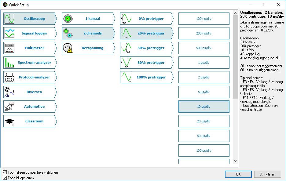 為了簡(jiǎn)化測(cè)量設(shè)置,多通道示波器軟件具有大量快速設(shè)置,幾乎適用于所有應(yīng)用。快速設(shè)置包含特定測(cè)量的所有基本設(shè)置以及與所選快速設(shè)置相關(guān)的附加信息,例如如何連接儀器和/或附件。快速設(shè)置還可以包括參考示例信號(hào)。閱讀快速設(shè)置后,可以立即進(jìn)行相關(guān)測(cè)量,或者根據(jù)需要對(duì)設(shè)置進(jìn)行微調(diào)。
