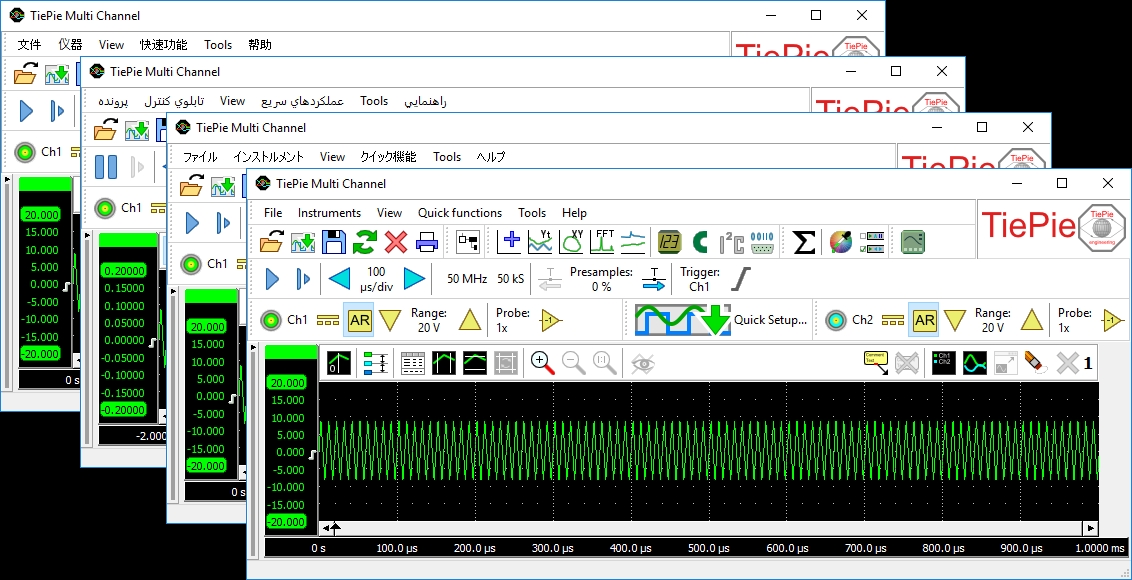 多通道示波器軟件 的用戶(hù)界面可以設(shè)置為多種不同的語(yǔ)言。可以使用以下語(yǔ)言: