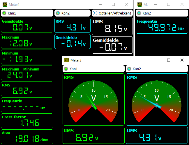 萬(wàn)用表可用于測(cè)量或監(jiān)視信號(hào)的特定屬性,例如有效值、頻率、最大值等。多通道示波器軟件萬(wàn)用表可以具有任意數(shù)量的完全可配置的顯示器,這些顯示器將測(cè)量值顯示為數(shù)字或通過(guò)帶有指針的時(shí)鐘。當(dāng)將電路調(diào)整到某個(gè)值(例如偏移為零)時(shí),帶有指針的時(shí)鐘顯示非常有用。