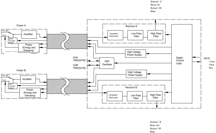 成電信號(hào),由 DPR500 接收器進(jìn)行處理。這些電信號(hào)被脈沖發(fā)生器中的前置放大器放大,然后被低噪聲接收器放大。信號(hào)通過(guò)可調(diào)高通和低通濾波器和可調(diào)增益級(jí)。DPR500 接收器增益范圍、帶寬和濾波器值取決于購(gòu)買的接收器類型。放大和過(guò)濾的信號(hào)在儀器的接收器輸出連接器上可用。