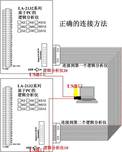 用一條同步扁平電纜,用二臺LA2132 構(gòu)成64通道邏輯分析儀,連接如下: