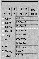 游標(biāo)的當(dāng)前位置顯示在右側(cè)窗口內(nèi),選擇特定的游標(biāo),或顯示窗口然后單擊箭頭能精確改變游標(biāo)的當(dāng)前位置。 游標(biāo)也能用鼠標(biāo)單擊光標(biāo)并且拖動(dòng)光標(biāo)而快速重新定位。該位置對于觸發(fā)點(diǎn)即絕對又相對,能用時(shí)間單位或數(shù)據(jù)采樣數(shù)字顯示。