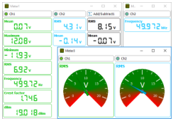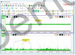 如上圖所示:標示的是兩個顯示屏,均顯示相同的測量信號。左側(cè)顯示尺寸對應(yīng)的是獨立臺式示波器相當(dāng)?shù)某叽? 8位分辨率下,縮放將不會顯示更多的細節(jié)。右側(cè)顯示對應(yīng)的是標準PC示波器屏幕上的最大化窗口;在14位分辨率下,用縮放能顯示更多的細節(jié)。