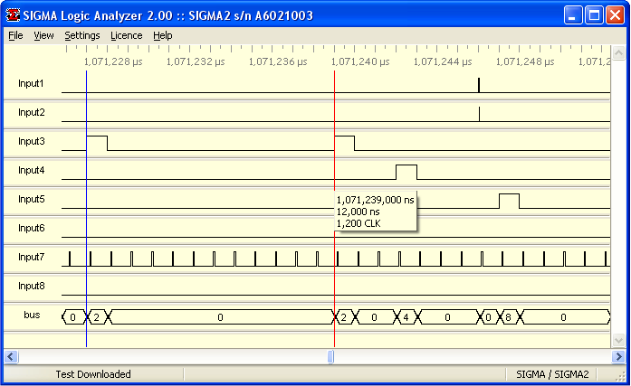 - Flexible trace definition (any combination of input signals and constant logic levels) and trace representation (signals, buses -- binary, octal, decimal, hexadecimal, ASCII). Input signal can be used in more than one trace.
