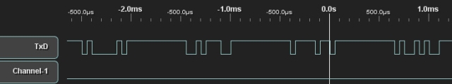 對于8N1的UART,假設需要捕獲數(shù)據(jù)串中的“o”這個字符,ACSII碼0x6F。由于UART低位在前發(fā)送,因此設置觸發(fā)數(shù)值0xF6。下圖為捕獲“o”這個字符的位置。