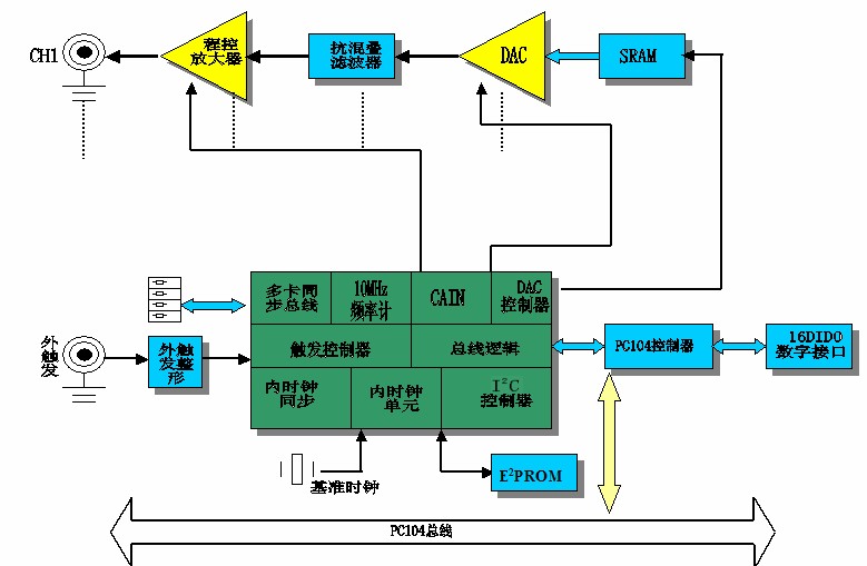 | LAI200-PC104V5.01任意波形發(fā)生卡,有一路波形輸出和8個數(shù)字量輸出。用戶可用鼠標編輯所需的任意波形,也可選擇正弦波、方波、三角波、鋸齒、TTL、白噪聲、高斯噪聲、梯形、指數(shù)、掃頻等常規(guī)波形,可設置波形的幅度、頻率、偏置量等參數(shù)。LAI200-PC104V5.01采用DDS合成技術、全表貼工藝、大規(guī)模FPGA技術,具有頻率精度高、分辨率高、可靠性好、軟件支持豐富等優(yōu)點,可廣泛用于個人實驗室和自動測試系統(tǒng)。 技術性能指標 波形輸出通道: 本卡的設計是將DAC時鐘和波形生產(chǎn)電路完全獨立開來,所以不需要重波形,很輕松地實現(xiàn)掃頻的功能: 假設:一正弦波 從20Hz~20KHz ,間隔為100Hz 1、 在軟件上選擇正弦,20KHz得到的時鐘是50M, 波形點數(shù)2500。生成此波形。 2、 10KHz時,DAC時鐘=2500*10000=25MHz按“設置”下的,修改DAC時鐘即可得到10KHz波形。 3、 100Hz時,DAC時鐘=2500*200=500KHz按“設置”下的,修改DAC時鐘即可得到100Hz波形。 以此類推,可以得到各個頻率的信號,實現(xiàn)掃頻功能。 |