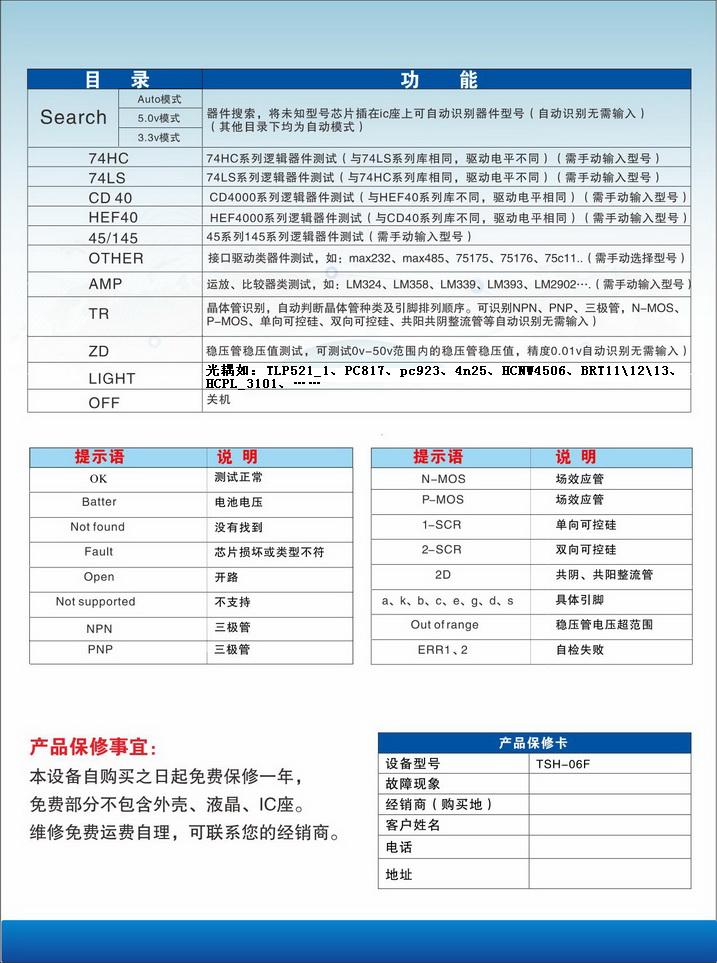 TSH維修精靈是一款專門為一線維修人員設(shè)計(jì)的多功能維修測(cè)試儀,可選擇不同的測(cè)試模式5v模式、3.3v模式、auto模式等可以測(cè)試74ch系列、74ls 系列、CD4000系列、HEF400系列、4500系列、運(yùn)算放大器、接口類芯片、光耦、晶體管自動(dòng)識(shí)別、穩(wěn)壓管穩(wěn)壓值識(shí)別等等。內(nèi)置各類芯片數(shù)據(jù)模型 1300余種、晶體管數(shù)據(jù)模型420余種, 涵蓋了常見的大部分24腳以內(nèi)的器件,可以大幅度降低維修工作量,提高維修效率。